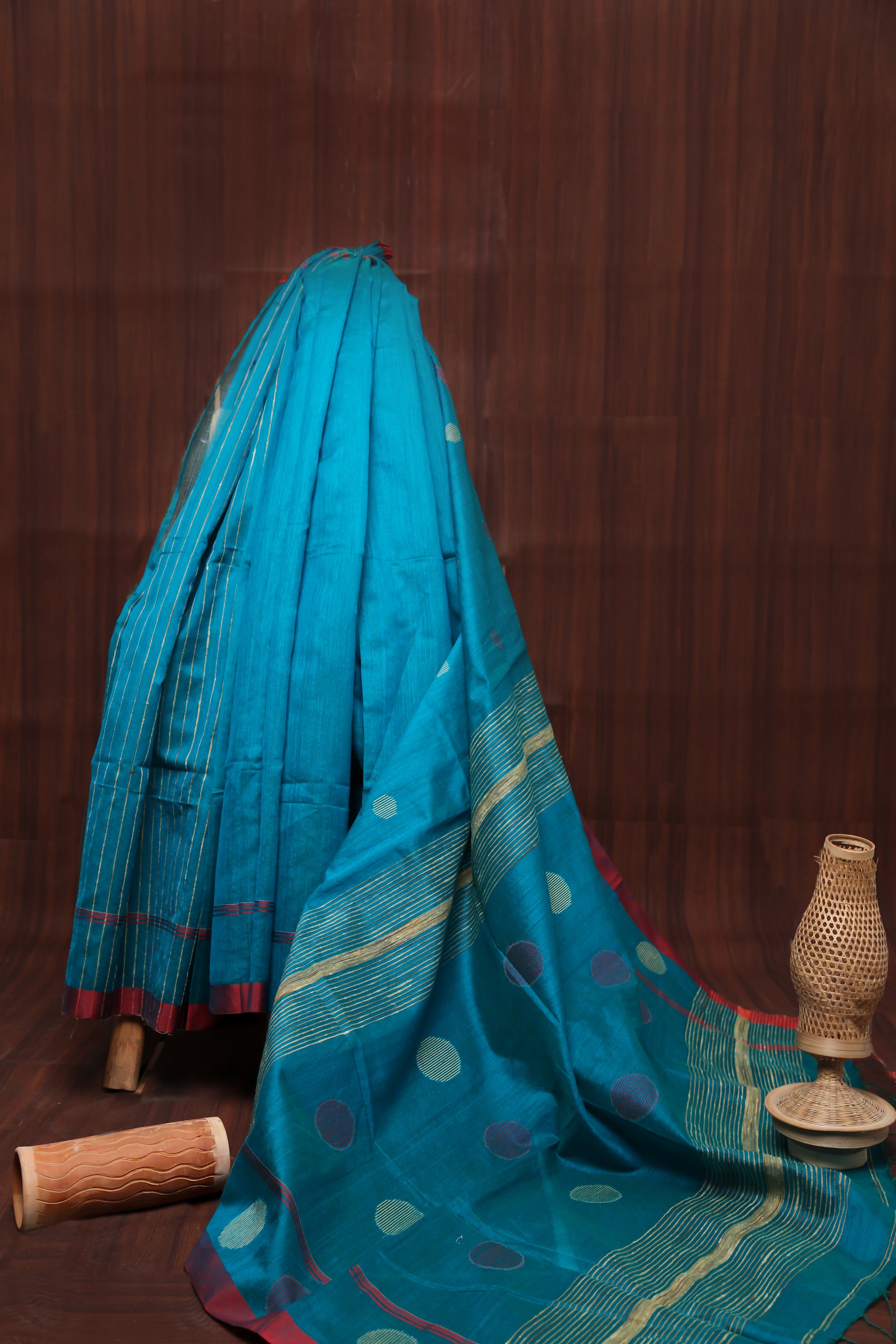 Do you want to turn some heads this festive season? This luxurious saree is a blue colored beautiful piece of grace that is made with medium circle patches all over the body. The highest-standard cotton silk gives it a royal touch.
