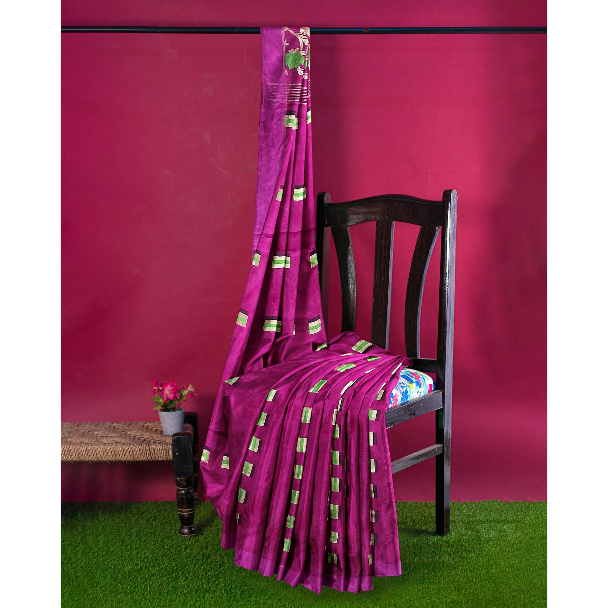 Elegant Rani-Colored Cotton Silk with Pom Pom Border
