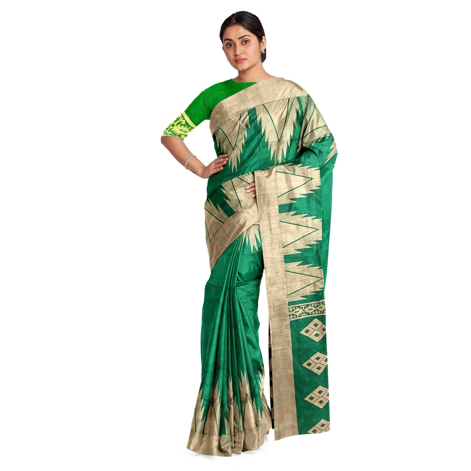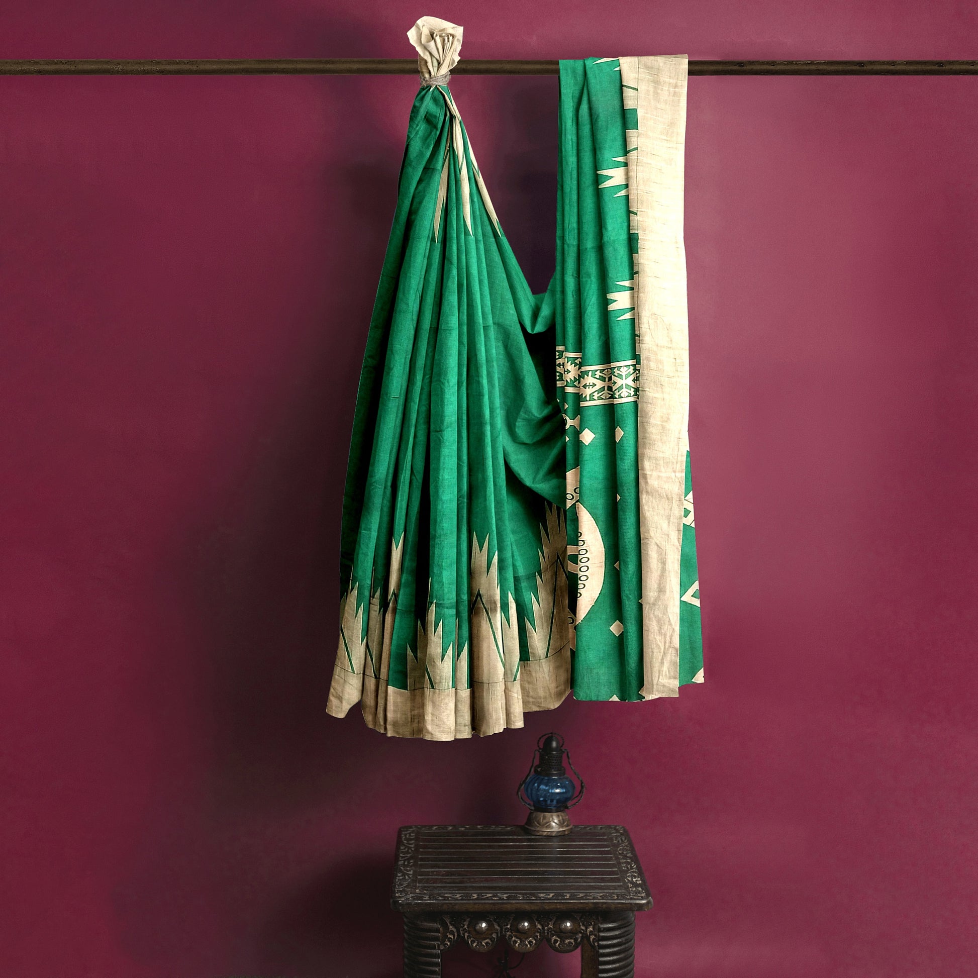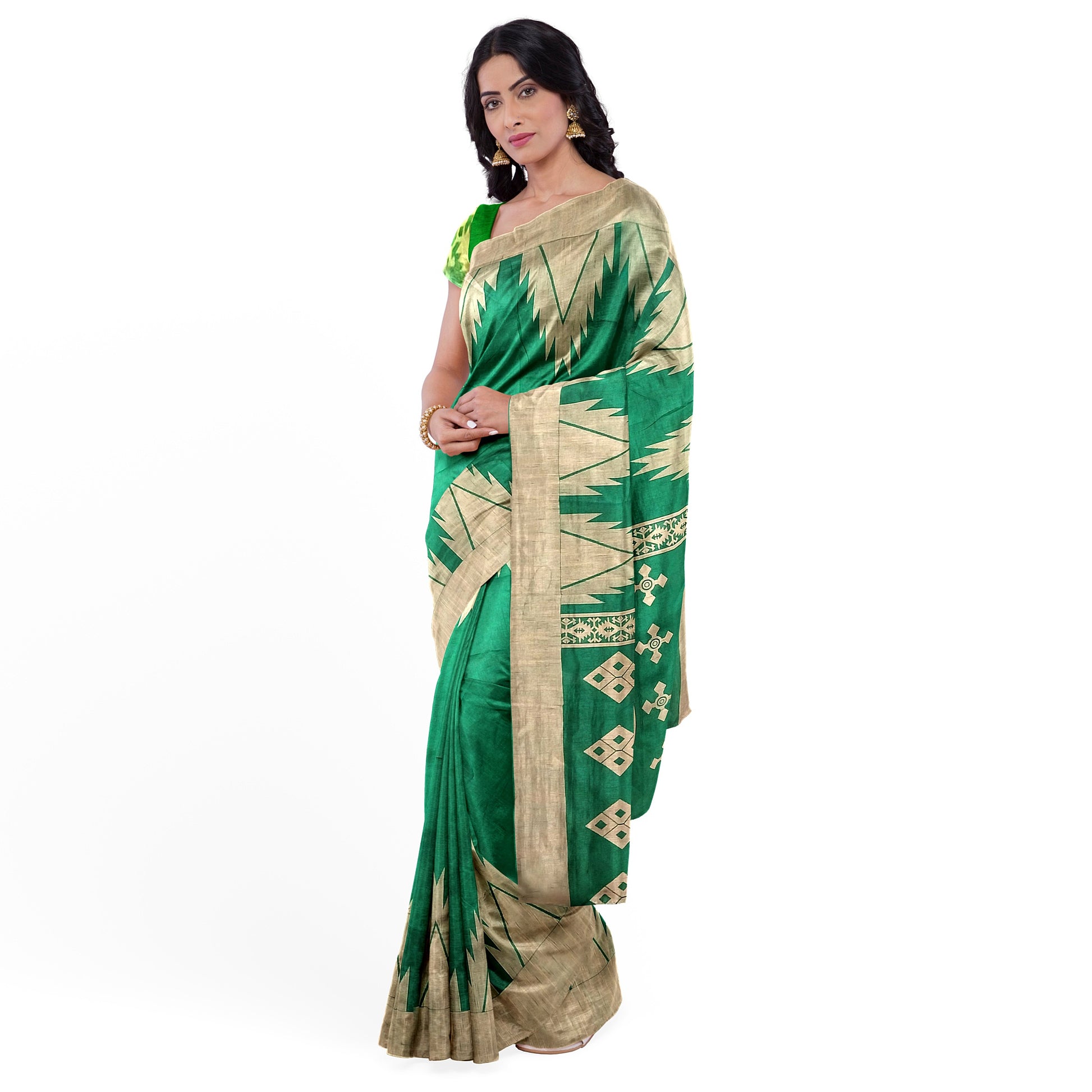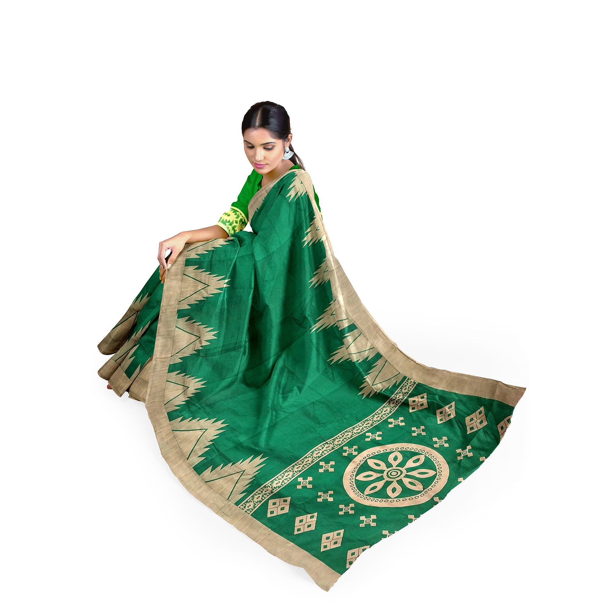 This is a beautiful piece with printed designs all over the green-colored body with golden hues.