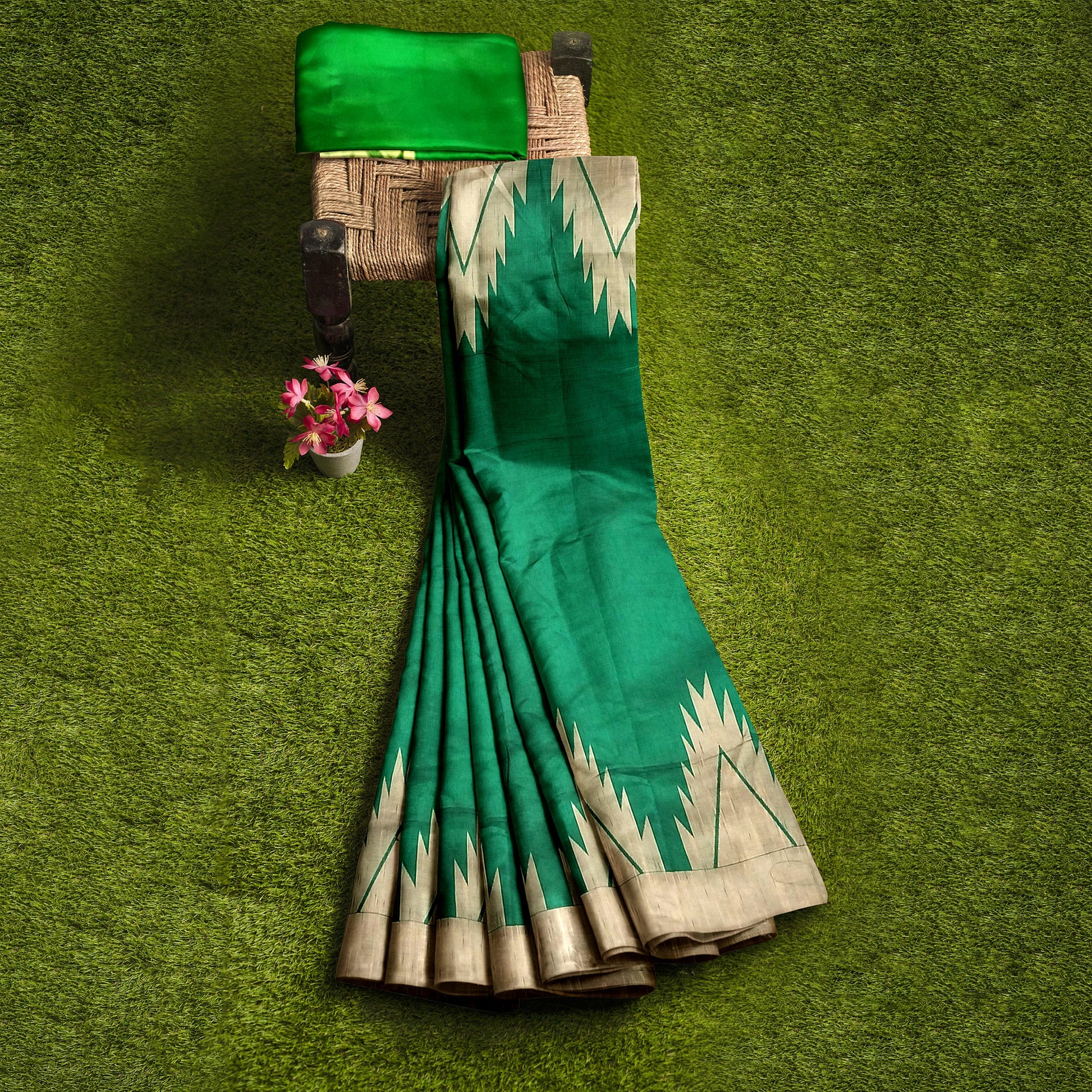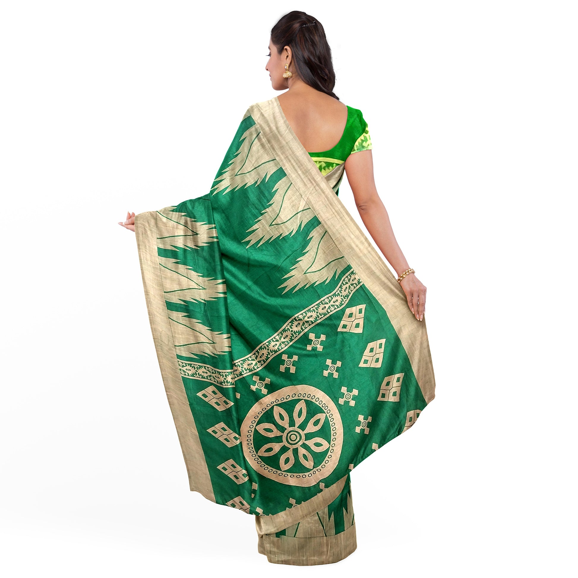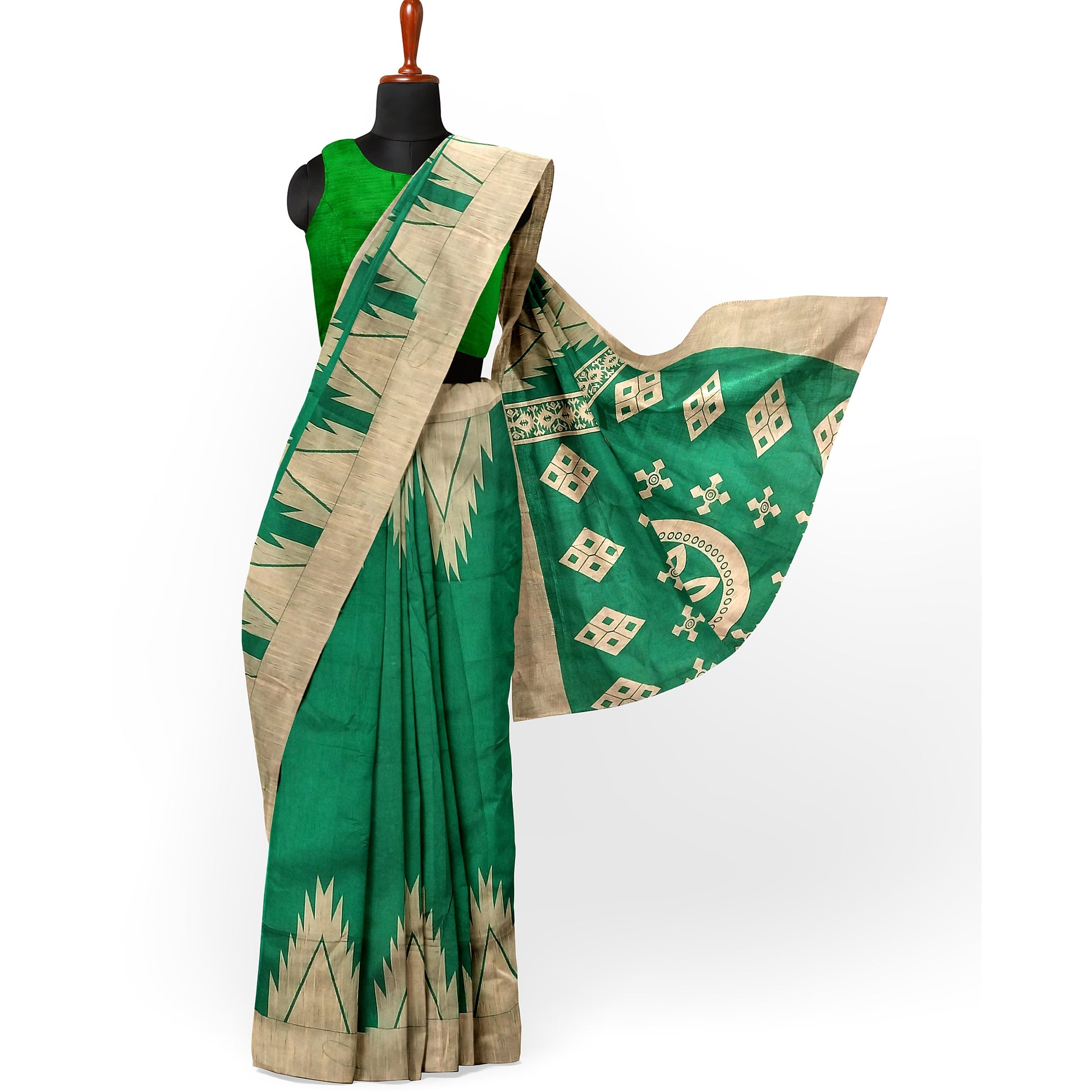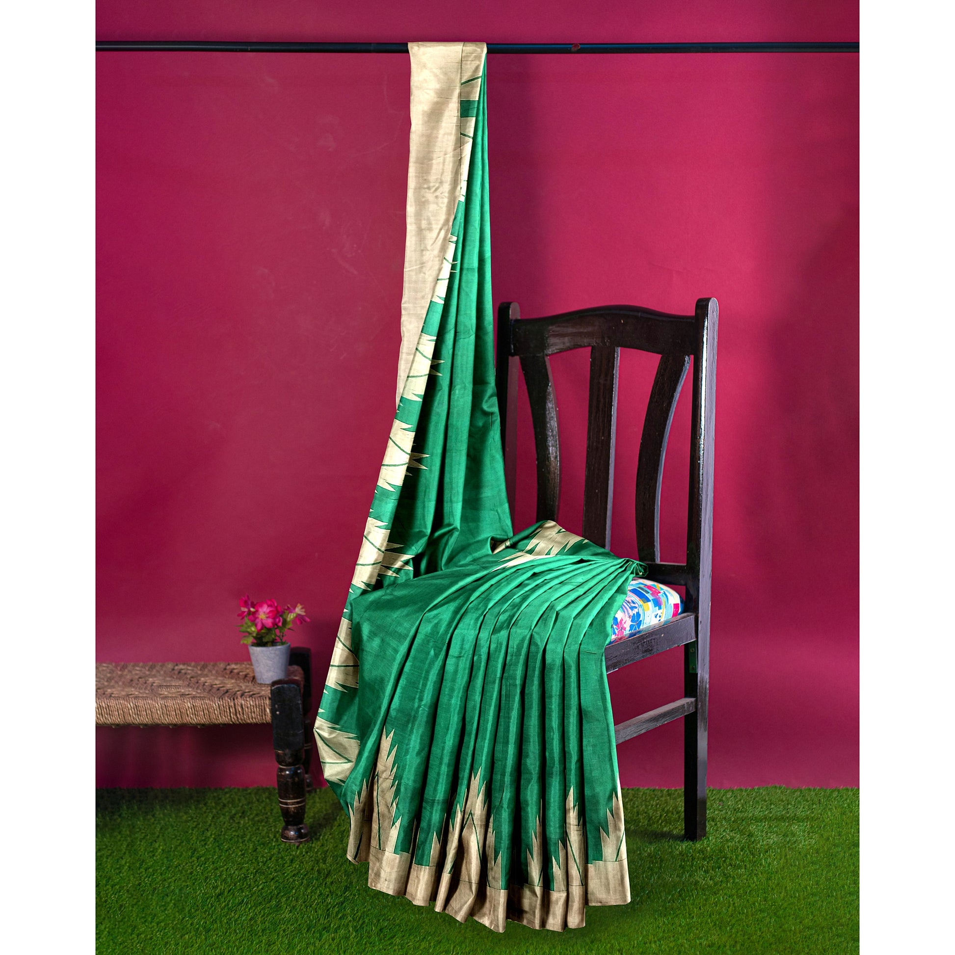 This is a beautiful piece with printed designs all over the green-colored body with golden hues.