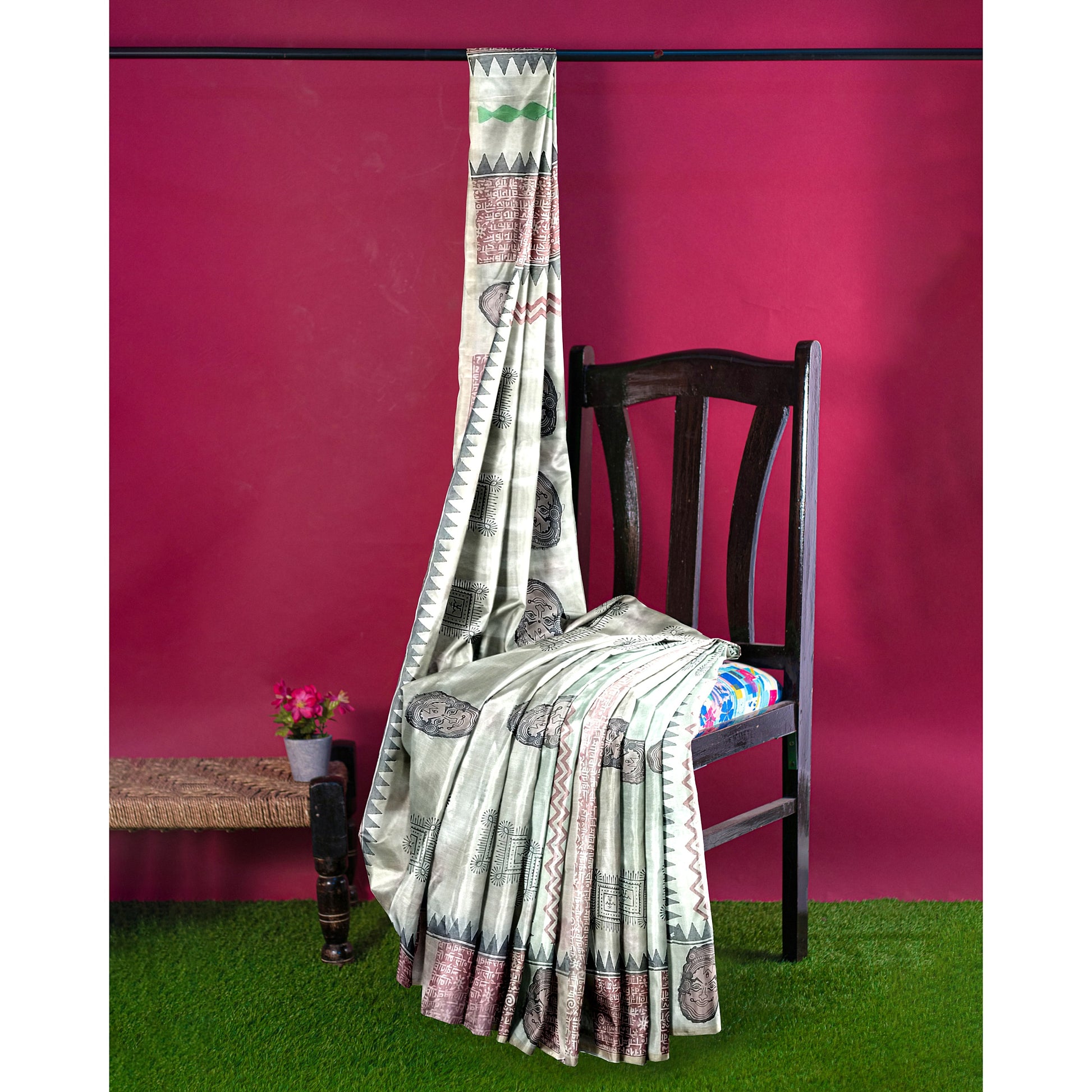 The border of this saree has red coloured patches giving it an abstract feel. Pair this saree with some oxidized jewellery and you’re all set to make an impression.