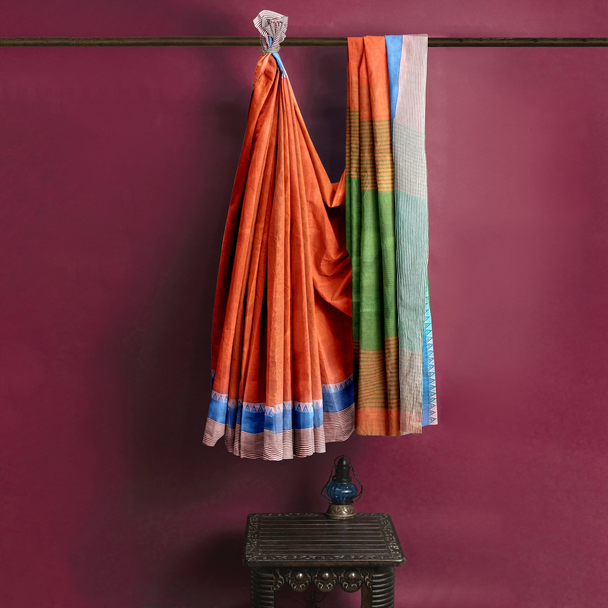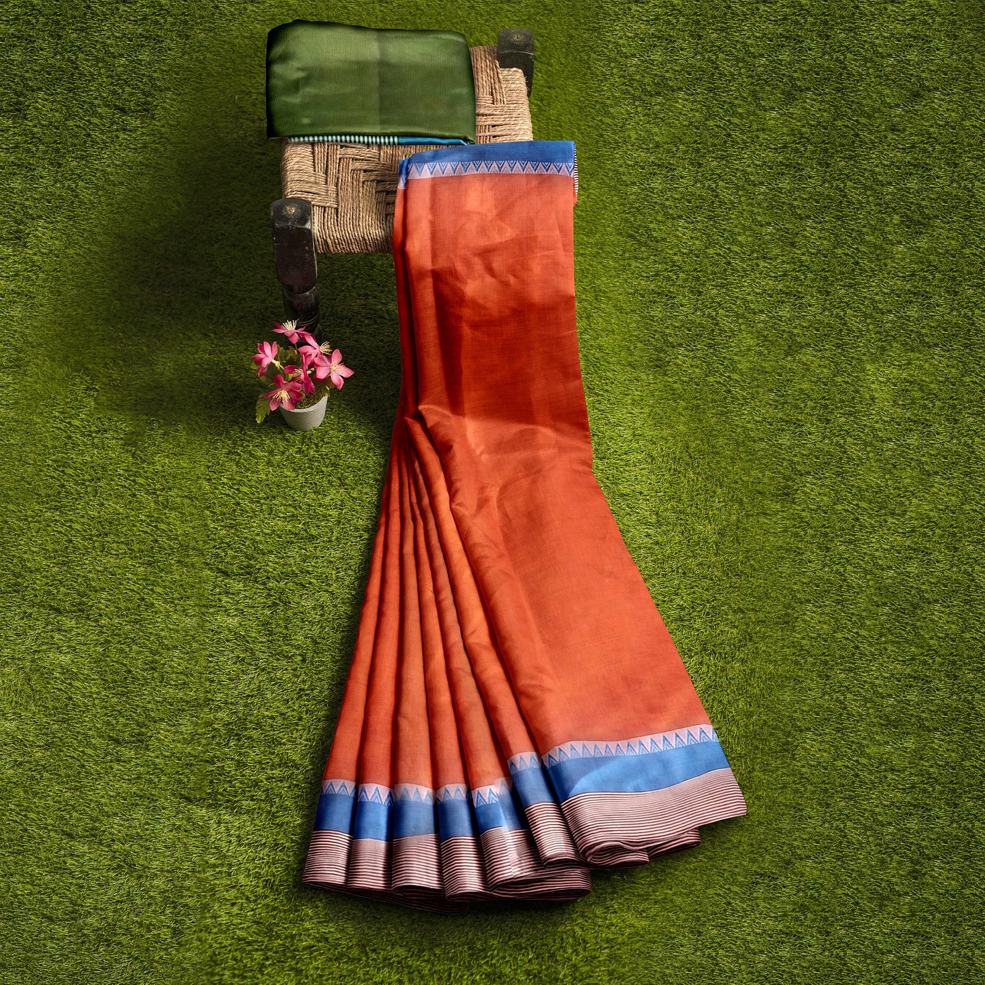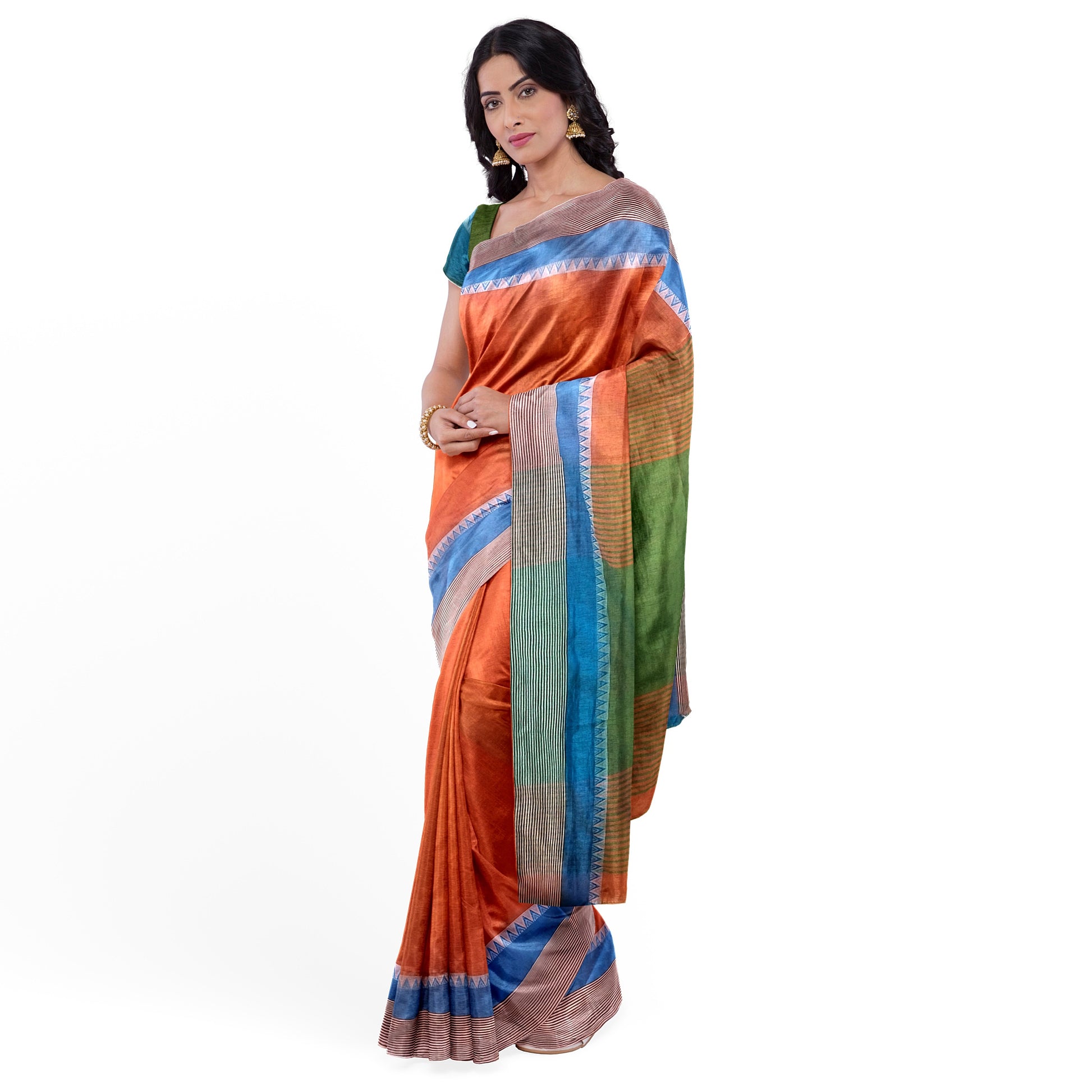 Featuring an orange saree in cotton silk base with a vibrant orange-hued coloured patch-filled border. As you wear this simple orange saree, which is trendy yet classy and comes with an unstitched blouse piece, you are sure to dazzle everyone.